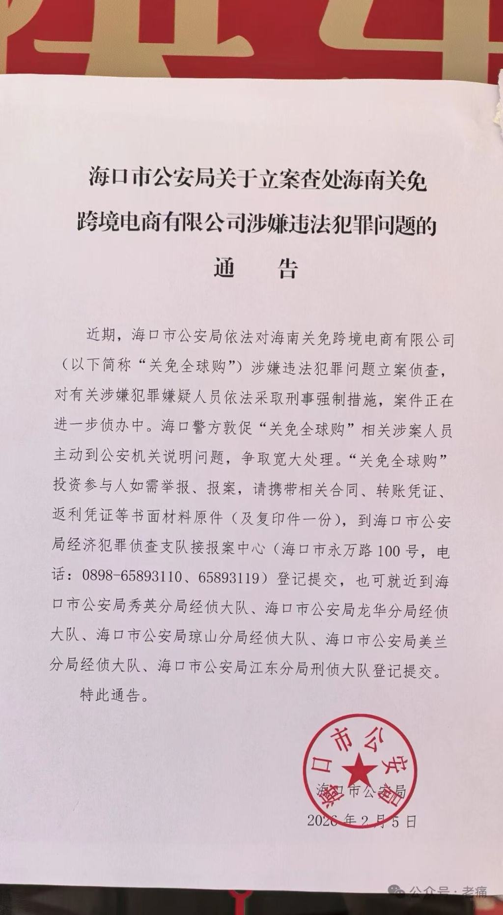 2月5日散户股票配资,海口市公安局发布《关于征集“关免全球购”涉嫌违法犯罪线索的通告》(以下简称:《通告》)称,该局依法对海南关免跨境电商有限公司(对外简称“关免全球购”)涉嫌违法犯罪问题进行立案侦查,并对该公司实际控制人及相关管理人员等8名犯罪嫌疑人依法采取刑事强制措施。为依法惩治犯罪、保护投资人合法权益,现向社会公开征集“关免全球购”相关违法犯罪线索。